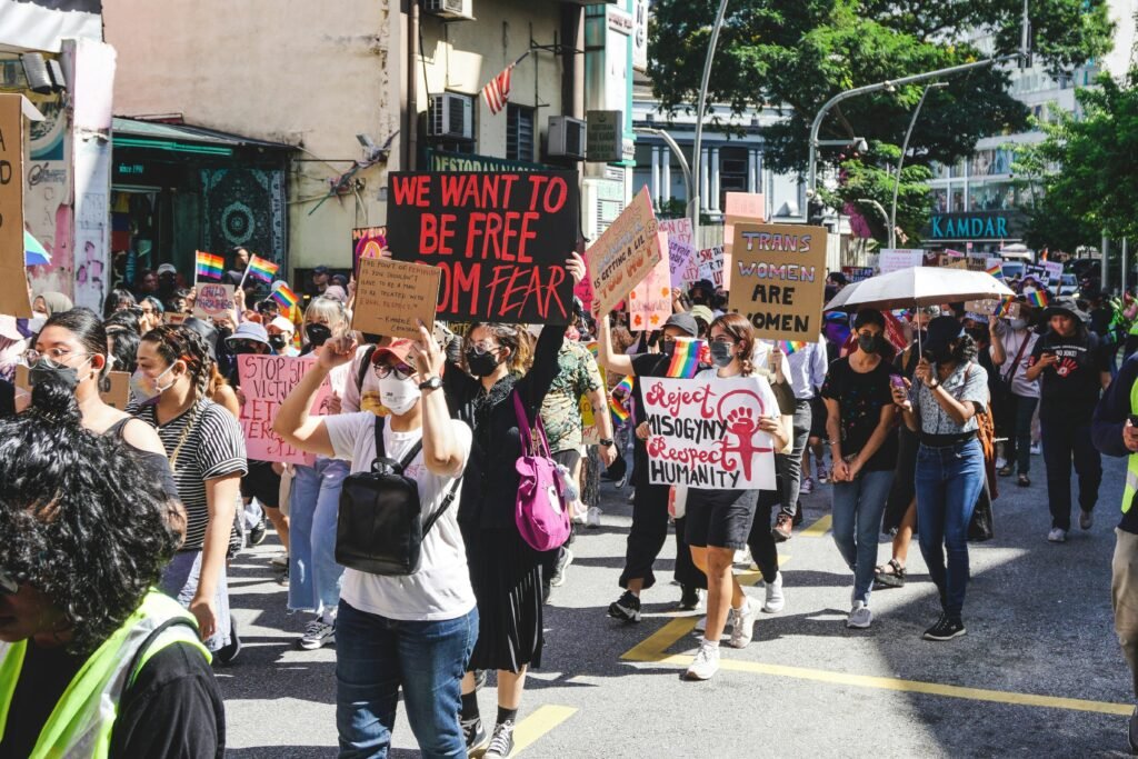 Image Description: People shown walking down a street at a women’s rights march in Kuala Lumpur, Malaysia in 2023. They are holding placards, with one reading “reject misogyny, respect humanity”.